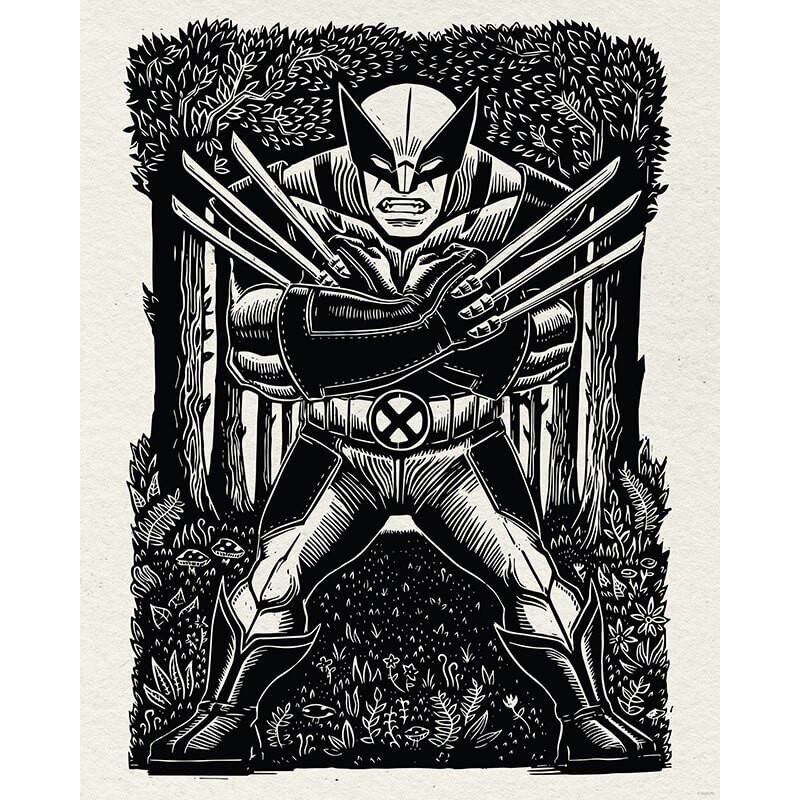 La sauvagerie et la détermination à l'état pur - Wolverine dans sa position de combat emblématique, toutes griffes dehors et le regard déterminé, respirant la force et l'intrépidité. Intégrée dans une scène de forêt détaillée, la toile sur châssis souligne la nature animale de Wolverine et son lien avec la nature sauvage. Le style linoléum et les détails contrastés en noir et blanc confèrent à l'image une esthétique intemporelle.