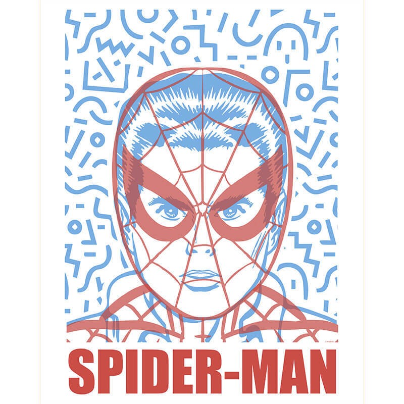 Cette affiche met en scène Spider-Man dans un design unique et moderne, alliant dessin au trait minimaliste et couleurs pop. Le visage saisissant de Spider-Man est mis en valeur par son masque emblématique, puissamment mis en valeur par les tons rouges et bleus. Le fond vibrant de motifs abstraits confère à l'image une énergie ludique et dynamique, idéale pour les fans du célèbre lanceur de toiles et d'art moderne.