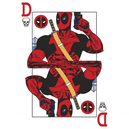 Cette affiche est une représentation créative et originale de Deadpool dans le style d'une carte à jouer. Conçue comme un " D " pour Deadpool, l'antihéros culte se présente en rouge vif et en noir, complétés par des détails iconiques.