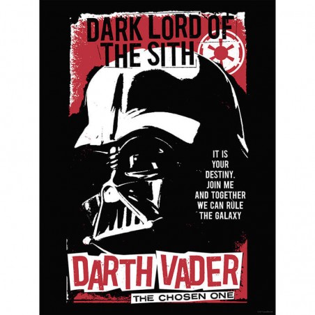 L'image montre une représentation iconique de Dark Vador, le célèbre antagoniste de la saga Star Wars. Il est conçu dans un style d'affiche rétro, avec des couleurs dominantes comme le noir, le rouge et le blanc, qui soulignent l'atmosphère sombre et menaçante. Parfait pour tous les amateurs de Star Wars !