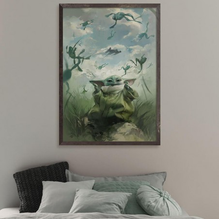 Grogu, connu sous le nom de " Baby Yoda ", est ici représenté dans un environnement naturel paisible, entouré de grenouilles flottantes, soulevées par la Force. Les couleurs délicates et la lumière douce du tableau créent une atmosphère apaisante, tandis que les grenouilles en train de jouer donnent au motif un aspect vivant. Une oeuvre d'art parfaite pour les fans de The Mandalorian, qui capture la magie et l'innocence de ce personnage populaire et ajoute une touche d'harmonie galactique à n'importe quelle pièce.