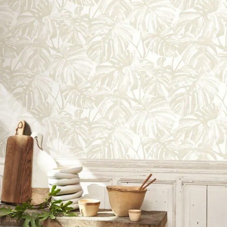 Comme découpées au pochoir, les grandes feuilles de Monstera s'élancent sur les murs avec légèreté. Le papier peint Mata révèle une composition graphique et aérienne où la nature s'exprime dans toute sa finesse. Sophistiqué seul, il s'accorde aussi parfaitement avec la frise Ocelot pour un duo raffiné et équilibré. Les formes végétales stylisées apportent profondeur et mouvement, créant un décor apaisant et lumineux.