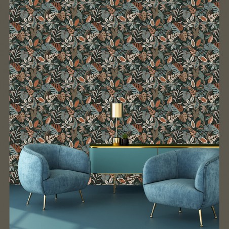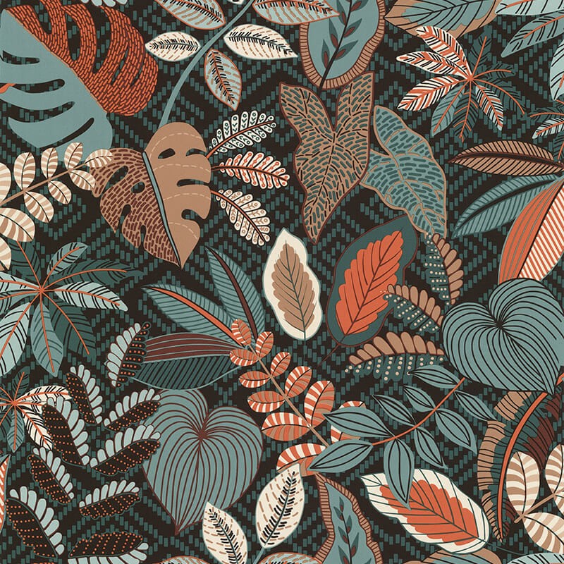 Ce papier peint déploie une jungle généreuse et stylisée, où les feuilles se superposent dans une palette profonde de bleu canard, terracotta et beige. Le fond sombre à l'effet tressé intensifie le relief du motif et apporte une vraie sophistication. Un décor végétal moderne, vibrant et enveloppant, parfait pour donner du caractère à un espace de vie.