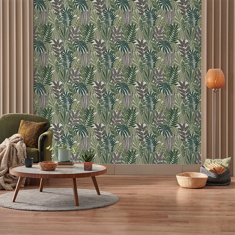 Ce papier peint réunit une multitude de feuillages tropicaux travaillés dans des verts profonds et lumineux. Les détails noir et blanc apportent un contraste graphique qui modernise l'ensemble. Entre textures végétales, traits stylisés et volumes généreux, ce décor crée une ambiance fraîche, vivante et contemporaine. Idéal pour dynamiser un salon, une entrée ou une chambre avec une touche jungle chic.