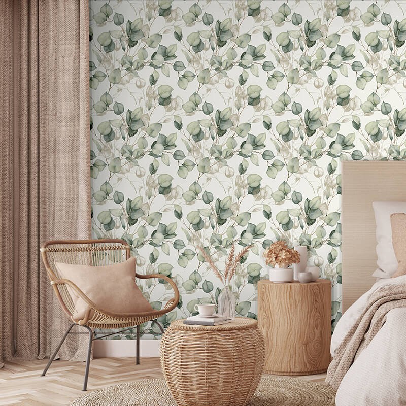 Ce papier peint illustre de fines branches d'eucalyptus peintes à l'aquarelle, dans une palette douce de verts brumeux et de beiges poudrés. Les contours délicats et les transparences apportent une sensation de légèreté, presque flottante, qui adoucit immédiatement la pièce. Un décor poétique, lumineux et naturel, parfait pour instaurer une ambiance sereine et élégante dans un intérieur contemporain ou cocooning.