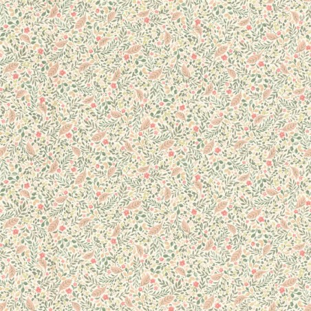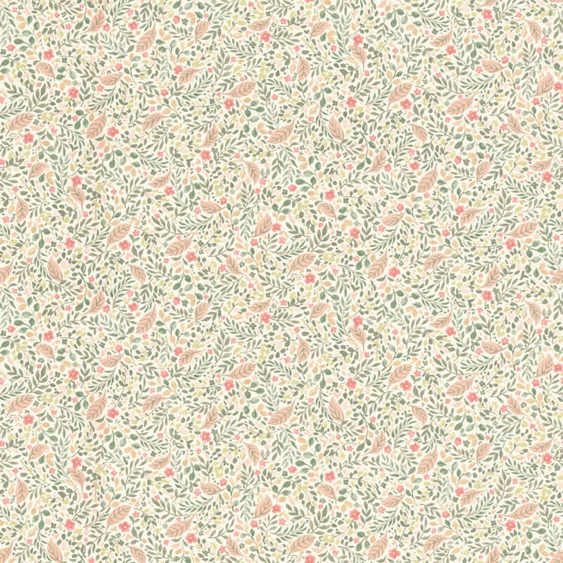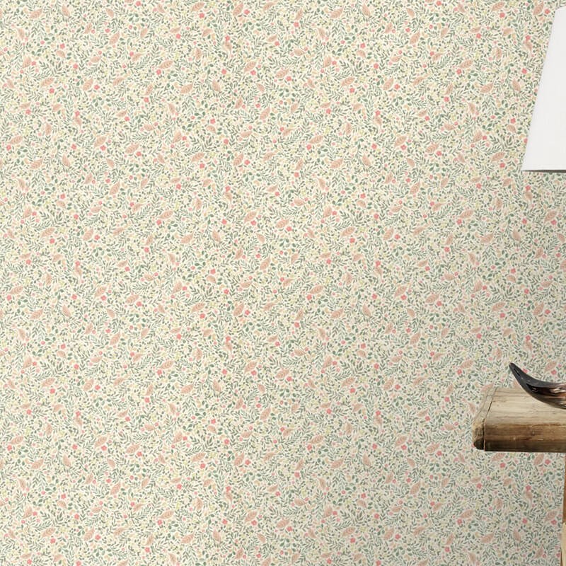 Ce papier peint déploie un délicat motif fleuri façon herbier, composé de petites feuilles et de fleurs stylisées. Les tonalités douces — vert sauge, rose poudré, abricot — créent une ambiance lumineuse et pleine de fraîcheur. Avec son rythme fin et régulier, ce décor apporte une touche bucolique et chaleureuse, idéale pour une chambre, une entrée ou un intérieur au style cottage chic. Un motif qui respire la douceur et la légèreté.
