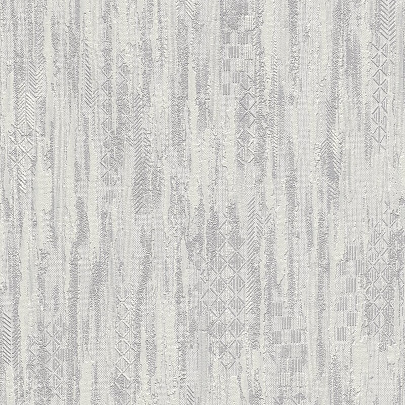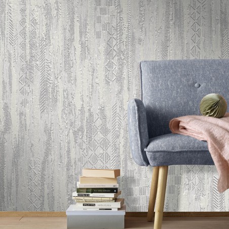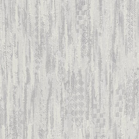 Ce papier peint se distingue par un motif graphique structuré, composé de lignes verticales et de formes géométriques subtilement intégrées. Son relief travaillé crée un effet de matière élégant qui apporte du rythme et de la profondeur aux murs.
