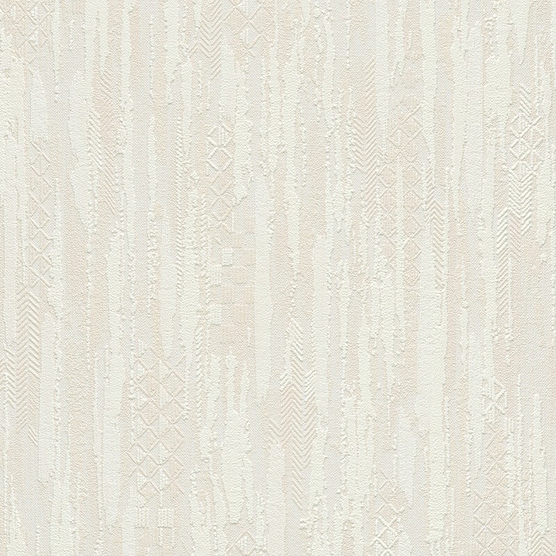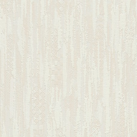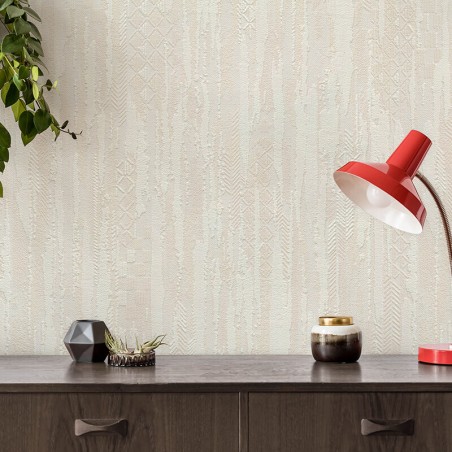 Ce papier peint se distingue par un motif graphique structuré, composé de lignes verticales et de formes géométriques subtilement intégrées. Son relief travaillé crée un effet de matière élégant qui apporte du rythme et de la profondeur aux murs.