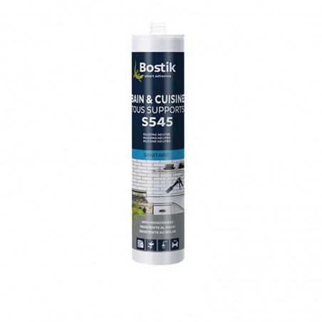 Mastic S545 d'étanchéité tous supports Bostik 300ml 30626076 Mastic silicone neutre bain & cuisine tous supports. Anti moisissures. Mastic silicone neutre traité fongicide (anti moisissures), spécialement destiné à la réalisation de joints d'étanchéité sur supports synthétiques. Etanchéité des joints dans les locaux sanitaires : au droit des baignoires, bacs à douches, lavabos, éviers etc. à la jonction sol / mur. Très bonne résistance à l'eau, à l'humidité et aux détergents ménagers Avantages : - Traité anti moisissures (fongicide) - Adhérence parfaite sans primaire sur tous les types de supports, même sur les supports synthétiques - Peu de retrait (XS) - RAL 7016 (gris anthracite) disponible - Inodore - Très bonne résistance à l'eau, à l'humidité et aux détergents ménagers - Grande facilité d'utilisation (lissage et extrusion) - Grande résistance aux moisissures - Très bonne qualité de finition- Certifié ISEGA alimentaire BOSTIK S545 BAIN CUISINE TOUS SUPPORTS est un mastic silicone neutre traité fongicide (anti moisissures), spécialement destiné à la réalisation de joints d'étanchéité sur tous les types de supports dans les locaux sanitaires (baignoires, bacs à douches, lavabos, éviers, à la jonction sol / mur) et spécialement recommandé sur les supports synthétiques. Recommandé pour les plombiers et installateurs sanitaires Ne peut pas être peint. 12 m environ de cordon de diamètre 5 mm Mise en oeuvre : Température d'application de +5 °C à +40 °C (s'applique à l'environnement et aux supports). Dans tous les cas, les supports seront propres, secs, sains (non pulvérulents), dépoussiérés et dégraissés. Toujours tester l'adhérence avant l'application. Eliminer toutes les parties friables ou mal adhérentes Placer la cartouche dans le pistolet Bostik Maxi Sealant Gun Extruder le mastic S545sur le joint à réaliser.Après extrusion, serrer et lisser le cordon de mastic dans les 10 minutes de préférence avec Bostik Finishing Soap.