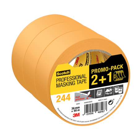 Le ruban de masquage professionnel 3M 244 est notre ruban polyvalent destiné au masquage d'une grande variété de surfaces, pour les travaux de peinture à base d'eau ou de solvant. Il est disponible en rouleaux de 36 mm x 50 m.