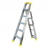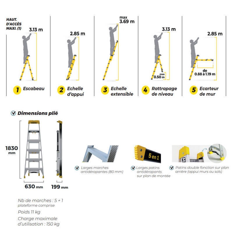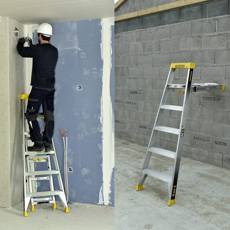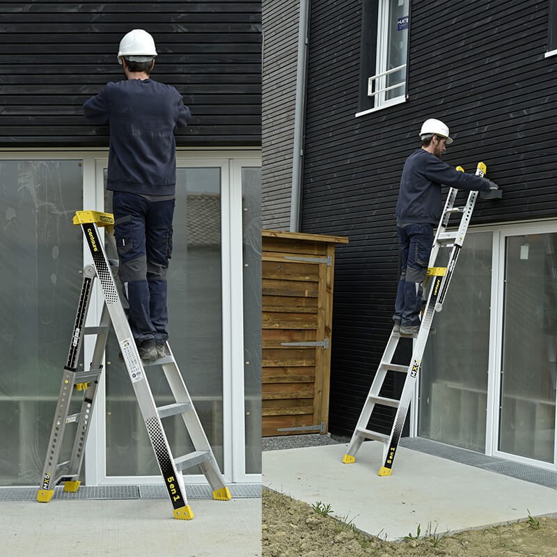 - Escabeau 5 en 1 en aluminium très pratique sur tous les chantiers grâce à ses 5 fonctions: escabeau, échelle d'appui, échelle extensible, rattrapage de niveau et écarteur de mur.