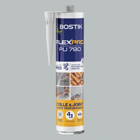 BOSTIK FLEXPRO PU790 est un mastic-colle polyuréthane avancée multi-usages innovant, destiné à la réalisation de joints à élasticité durable d?étanchéité (bâtiment et périphérique de menuiserie), de calfeutrement, de dilatation, de sols, de soubassements semi-enterrés, sur la plupart des supports utilisés dans le bâtiment (béton, maçonnerie, aluminium, bois, verre, carrelage, PVC, revêtement PVC).