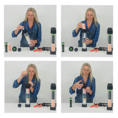 - Un filtre spécial avec billes orange qui absorbe l'humidité et évite l'assèchement du contenu de la cartouche. Après une quarantaine d'utilisations les billes perdent leur couleur et leur efficacité, et il faut régénérer le filtre au μondes. Régénérer le filtre dans un récipient adapté au microondes, en fonction normale à 600 watts de puissance durant 2 minutes maximum.
