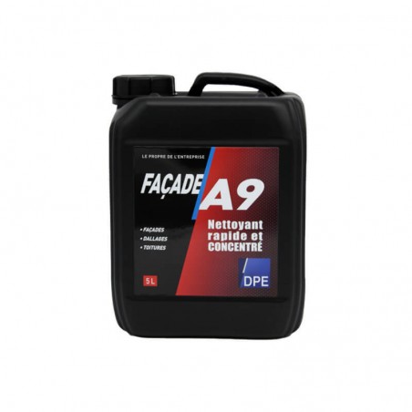 Nettoyant façade très rapide surpuissant concentré, diluable jusqu'à 80% dans de l'eau pour le nettoyage des surfaces peintes, brutes ou recouvertes d'un enduit hydraulique. FAÇADE A9 est un nettoyant façade à base d'agent de surface tensioactifs, de sels alcalino-terreux et d'hypochlorite de soude.