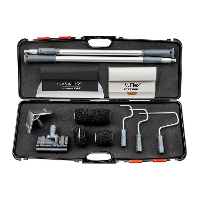 Chaque accessoire de la valise est pensé pour optimiser le confort et la précision. Les lames en inox trempé de 0,5 mm, les bords arrondis anti-trace et les truelles montées sur rotule permettent de travailler rapidement, même dans les angles. Les perches en aluminium, avec embout vissable et poignée caoutchoutée antidérapante, offrent solidité et sécurité.