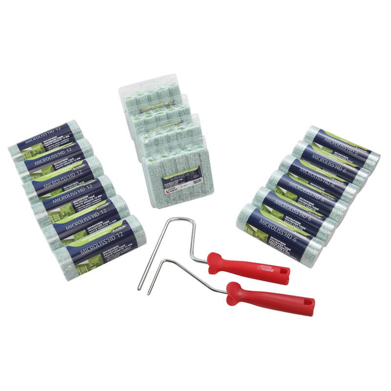 Le lot comprend 6 manchons clip Microliss HD 6 en 180 mm et 6 manchons clip Microliss HD 12 en 180 mm. Il inclut aussi 20 mini-manchons Microliss HD 6 en 110 mm et 20 mini-manchons Microliss HD 12 en 110 mm. Une monture clip Polypro 180 mm et une monture mini-rouleau 29 cm complètent l'ensemble pour une prise en main immédiate.