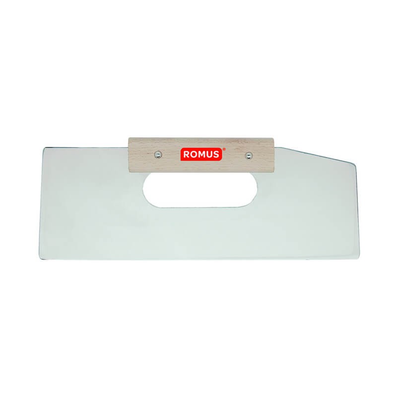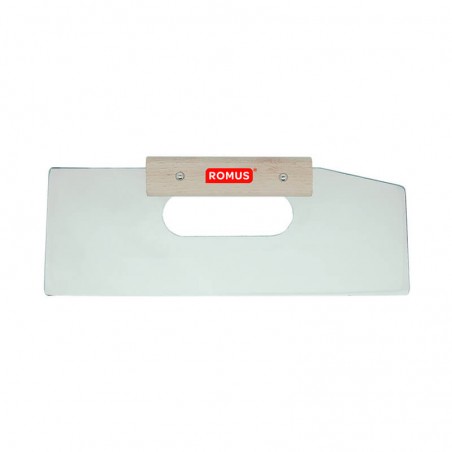 Modèle PRM-340. Largeur de travail 34 cm. Lame en acier inoxydable massif. Poignee bois. Poids 0,45 kg. Outil conçu pour un lissage intensif des revêtements muraux.