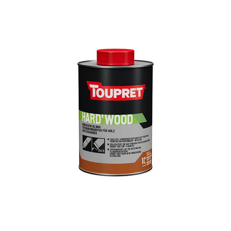 TOUPRET HARDWOOD 1l est un durcisseur pour redurcir et consolider les bois pourris par l'humidite et proteger les bois neufs avant recouvrement. Pour application manuelle en interieur et exterieur. HARD'WOOD s'applique sur tous support bois absorbants, secs ou humides prealablement ponces ou decapes et est recouvrable par tout type d'enduit special bois,