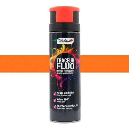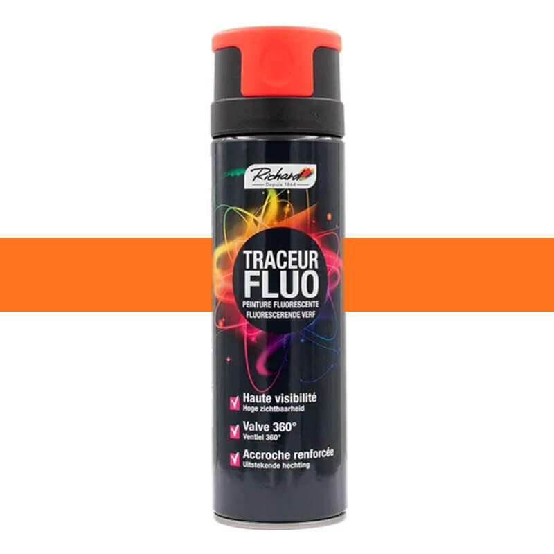 La bombe aérosol Richard traceur fluo est une peinture acrylique solvantée fluorescente à séchage rapide et haute adhérence. Elle rend les surfaces traitées lumineuses et visibles à distance, même avec peu de lumière. La peinture a un excellent pouvoir couvrant, ne jaunit pas. Elle peut être appliquée sur des supports en métal, plastique, bois, verre, céramique, enduit, carton, etc...