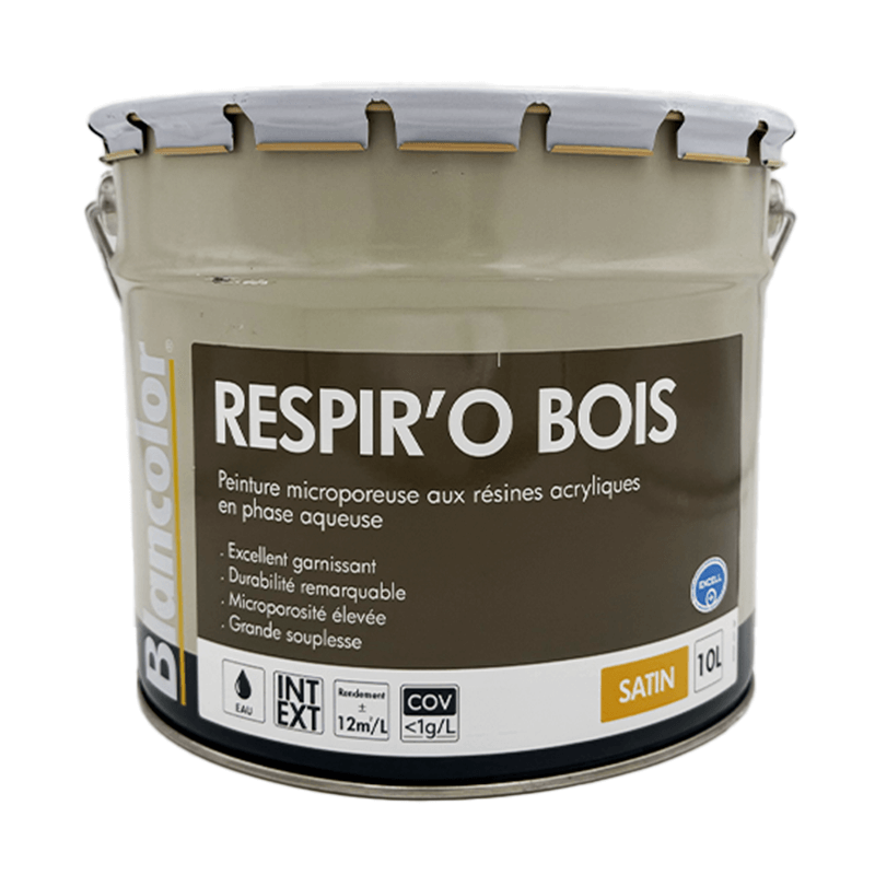 Peinture microporeuse aux résines acryliques en phase aqueuse. Peinture microporeuse aux résines acryliques en phase aqueuse. Respir'o bois Satin convient pour les travaux neufs, de rénovation ou d'entretien en intérieur ou extérieur sur tous équipements ou structures en bois : charpentes, bardages, menuiseries (frisettes, huisseries, portes, volets, clôtures...).