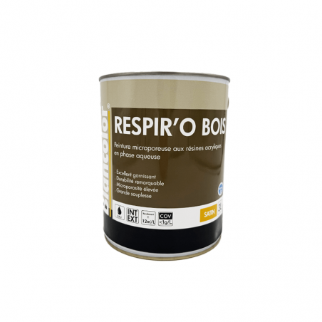 Peinture microporeuse aux résines acryliques en phase aqueuse. Peinture microporeuse aux résines acryliques en phase aqueuse. Respir'o bois Satin convient pour les travaux neufs, de rénovation ou d'entretien en intérieur ou extérieur sur tous équipements ou structures en bois : charpentes, bardages, menuiseries (frisettes, huisseries, portes, volets, clôtures...).