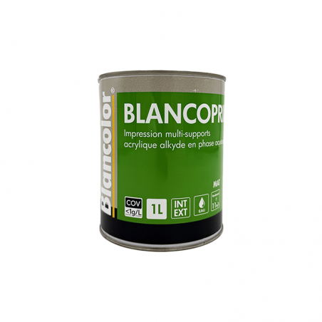 Blancoprim 1L Blancolor peinture d'impression multisupport acrylique alkyde en phase aqueuse. Produit de peinture en phase aqueuse pour couche d'impression ou primaire, spécialement adapté aux fonds peu poreux, à base de copolymères acryliques et alkydes en dispersion, destiné à être recouvert par un système de revêtement de peinture organique en phase aqueuse ou en phase solvant.