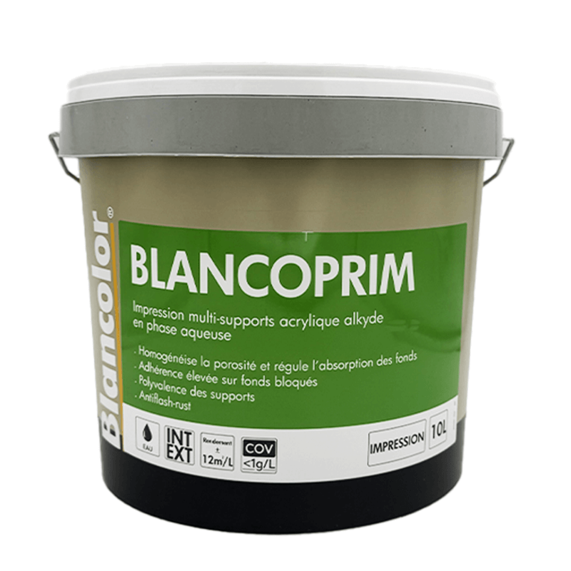 Blancoprim 10L Blancolor peinture d'impression multisupport acrylique alkyde en phase aqueuse. Produit de peinture en phase aqueuse pour couche d'impression ou primaire, spécialement adapté aux fonds peu poreux, à base de copolymères acryliques et alkydes en dispersion, destiné à être recouvert par un système de revêtement de peinture organique en phase aqueuse ou en phase solvant.