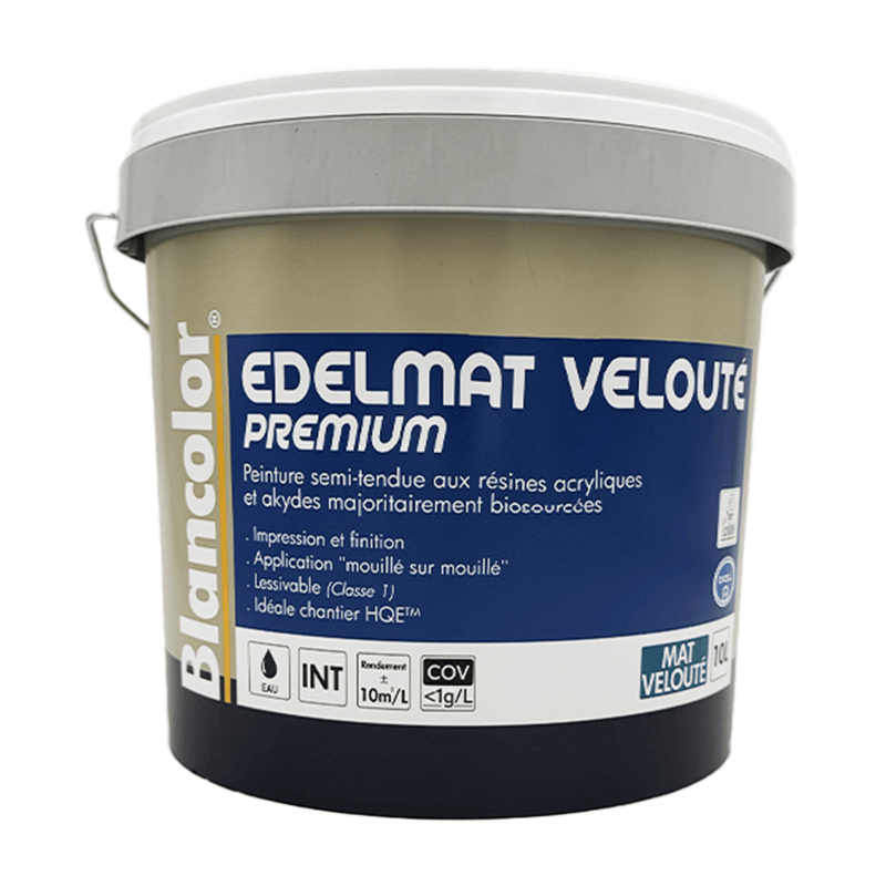 Edelmat velouté premium 10L Blancolor peinture semi-tendue aux résines acryliques et alkydes majoritairement biosourcées. Produit en phase aqueuse, d'aspect mat velouté, à base de résines acryliques et alkydes majoritairement biosourcées en dispersion pour une utilisation en peinture de surfaces intérieures. Bénéficie de l'Écolabel Européen et du label Excell. Est accessible aux exigences des certifications : HQETM, BREEAM®, LEED®.. Edelmat velouté premium convient pour les travaux neufs, de rénovation ou d'entretien en intérieur sur murs et plafonds et boiseries.