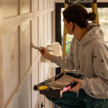 Flat Eggshell s'applique aussi bien sur le bois, le métal que le béton, et peut même être utilisée sur les sols. Elle met subtilement en valeur les plinthes, escaliers, portes et placards de cuisine, tout en assurant une protection durable contre les taches et l'usure.