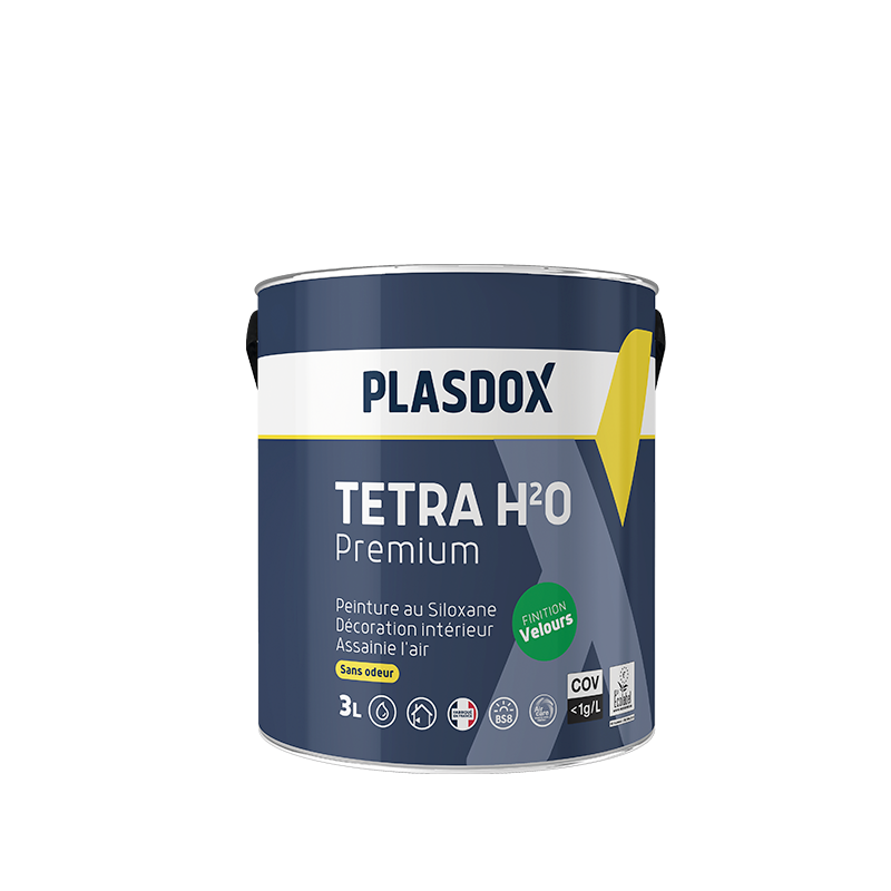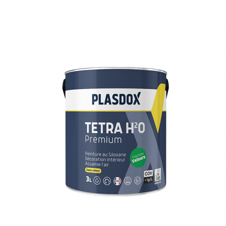 Tetra H2O velours premium Plasdox, peinture dépolluante finition velours renforcée au siloxane pour intérieur, phase aqueuse.