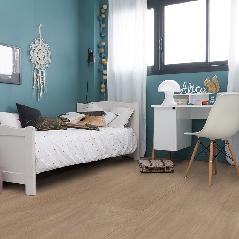 Le revêtement de sol sélectionné est un PVC acoustique multicouche, avec une double armature, groupe T d'abrasion, en rouleau de 2 m de large, de type TARALAY IMPRESSION HOP ACOUSTIC 33.