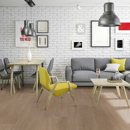 Le revêtement de sol sélectionné est un PVC acoustique multicouche, avec une double armature, groupe T d'abrasion, en rouleau de 2 m de large, de type TARALAY IMPRESSION HOP ACOUSTIC 43.