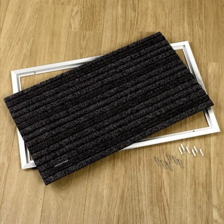 Prévoir une ouverture de 468 x 780 mm dans le sol. Ajuster le cadre préformé selon l'épaisseur de la sous-couche et du sol, puis fixer avec les vis et chevilles fournies. Poser ensuite le tapis dans le cadre pour finaliser la mise en place.