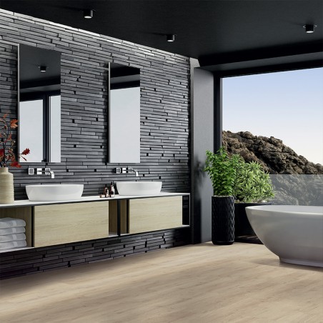 Ce revêtement se pose directement sur supports existants (carrelage, béton lisse...), à condition qu'ils soient plats, secs et propres. Aucun ragréage n'est nécessaire dans la majorité des cas. Prévoir un jeu de dilatation en périphérie.